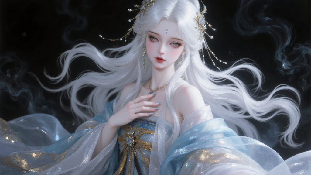 这幅仙侠风格数字艺术作品描绘了一位银白色长发的女性角色,发间点缀金色饰物,身着蓝白相间的飘逸服饰,衣上饰有金色纹样。人物面容清冷,眼神空灵,一手轻抚胸前姿态优雅。背景采用深色烟雾缭绕的设计,整体营造出神秘超凡的氛围,完美呈现了”银发白裳,蓝金缀饰”的空灵女神形象。